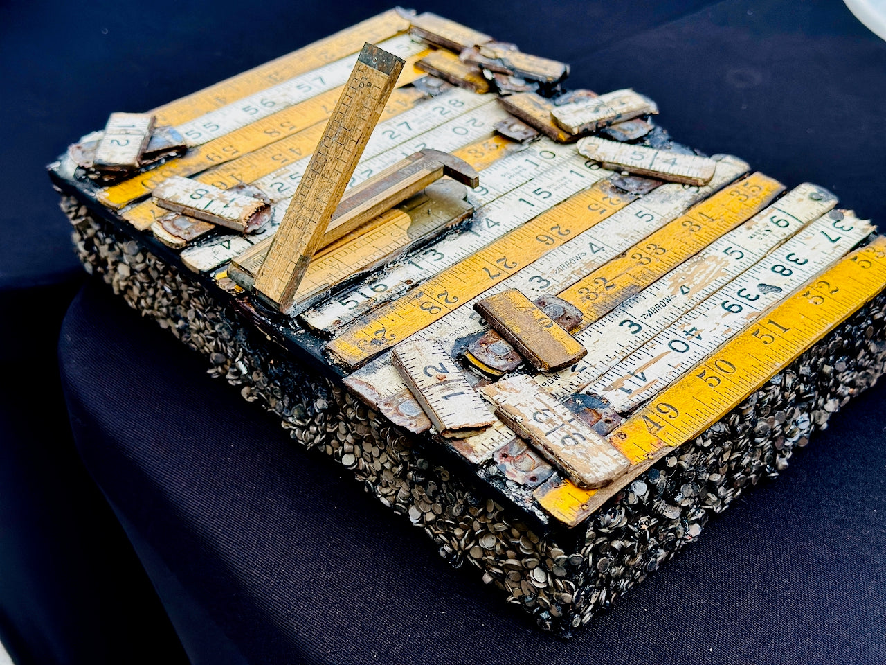 Add a playful touch to your space with this decorative cigar box adorned in vintage yellow and white yardsticks and rulers. Its charming, rustic design makes it a quirky accent for your mantel, workshop, or bookshelf. The lid is fixed shut, keeping its unique style intact. At Undercover Popular Leather Goods, we love turning everyday items into fun, one-of-a-kind pieces—this treasure is truly unique, and only one is available! Perfect for your handyman, carpenter or favorite DIYer!